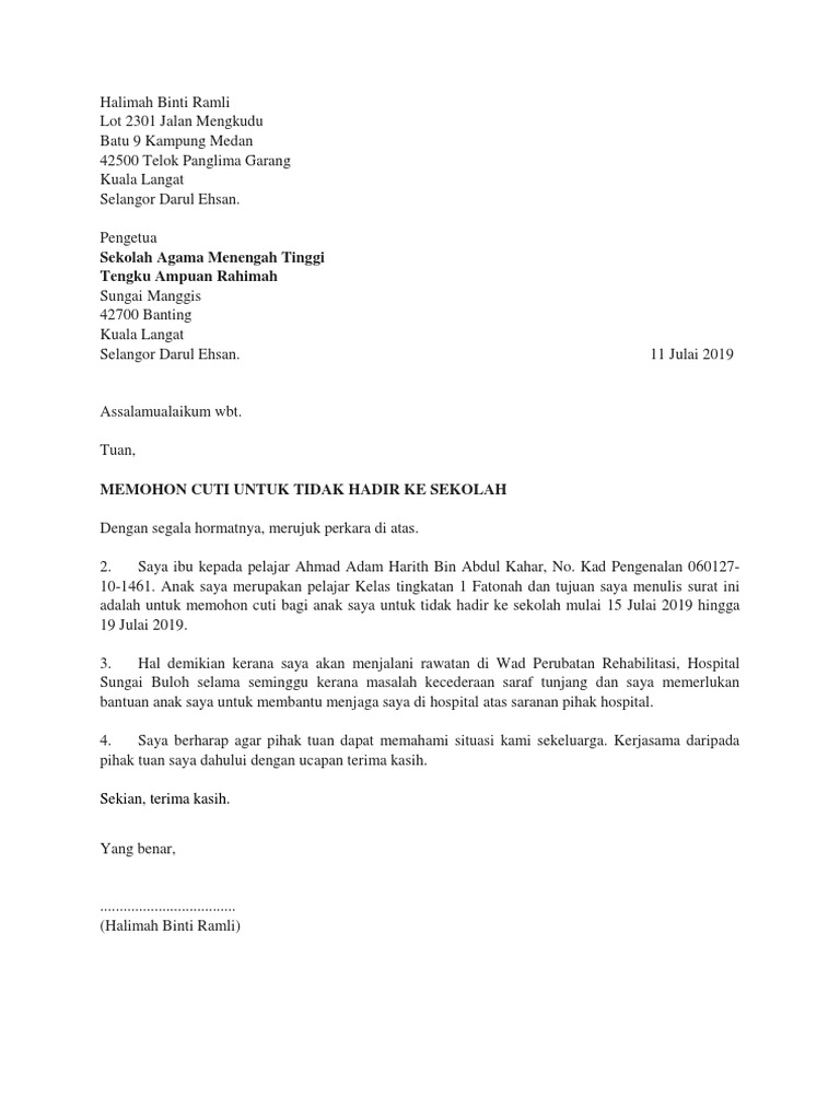 . Cuti Penggal 3. Anakjagaan saya tidak dapat hadir ke sekolah pada tarikh tersebut kerana. Surat cuti sekolah mestilah ditulis dengan format dan mengikut contoh surat kiriman rasmi tidak hadir ke sekolah yang terbaik.